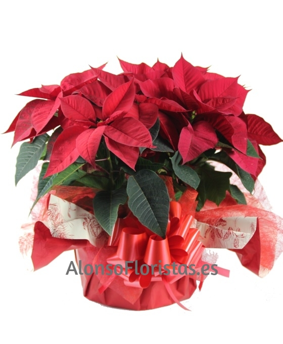 La Composición Flores de Pascua es el regalo perfecto para Navidad. Esta bonita composición de flores de pascua o poinsettias de nuestra Floristería en Leganés. La flor de Pascua está más presente que nunca en los días de Navidad. Las flores de Pascua son sin duda, un icono navideño. Tiene su origen en México, en concreto en Taxco de Alarcón, propia de regiones tropicales, tuvo su auge y expansión gracias a los frailes franciscanos en el siglo XVI, ya que con ella decoraban las Iglesias con estas flores de Navidad. Es por ello que a esta planta se la relacione con las fiestas navideñas para la decoración de los nacimientos. Pero quien dio a conocer al mundo a esta bonita planta de Navidad fue Joel Roberts Poinsett, embajador de Estados Unidos en México, quien a su vuelta al país norteamericano, se llevó varios esquejes con los que dio a conocer esta flor en América del Norte. Se extendió tanto esta planta que acabó convirtiendose en una tradición. Regalar una composición de Flores para Regalar en Navidad, es un buen regalo, lucirá por sus grandes flores de Navidad rojas, contrastadas con sus abundantes y grandes hojas verdes. Es ideal para regalar plantas en Navidad. Nuestros salones, oficinas y comercios, lucirán como nunca con estas bonitas plantas de Navidad.